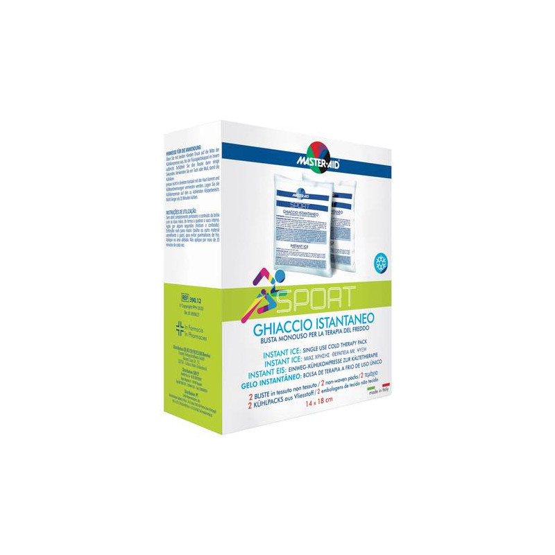 MASTER•AID SPORT GHIACCIO ISTANTANEO Dispositivo medico CE, classe IIa. Busta in tessuto non tessuto contenente nitrato ammonico e acqua. La busta ha una elevata capacità di raffreddamento che perdura per circa 30 minuti. Indicato in tutti i casi nei quali sia necessaria la terapia del freddo, in particolare: distorsioni, stiramenti muscolari, contusioni, mal di denti, cefalee ed emicranie, febbre, punture di insetti, epistassi (sanguinamento del naso), piccole scottature.