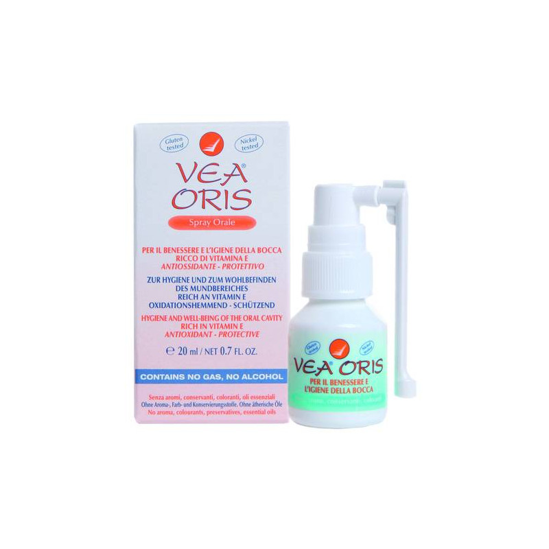 VEA ORIS Spray orale VEA ORIS contiene Olio VEA (Vitamina E acetato pura), con azione antiossidante e protettiva per l’igiene e il benessere del cavo orale. La formulazione semplice (2 soli ingredienti) e testata per il nichel e per il
