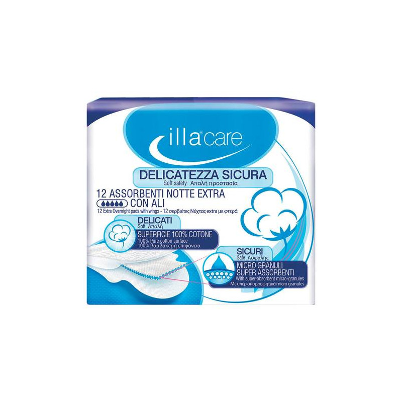 illacare notte extra Assorbenti con superficie di contatto in cotone non sbiancato, trattato con estratti di aloe, camomilla e malva. Indicati per un flusso abbondante.