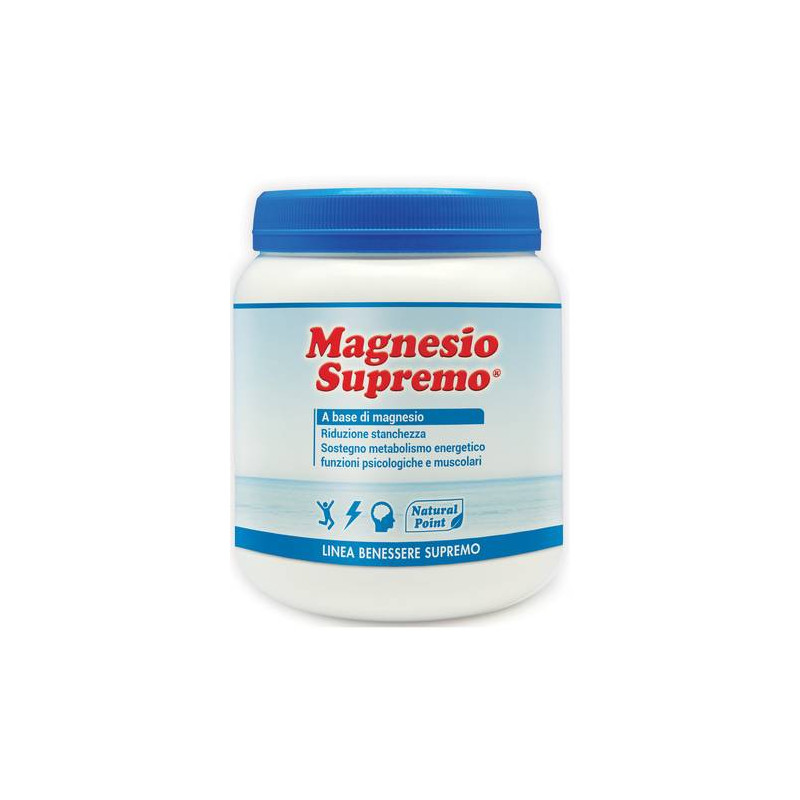 Magnesio Supremo, formula originale ed esclusiva di Natural Point, è una miscela costituita da acido citrico di origine vegetale e magnesio carbonato di origine marina. La miscela in acqua si trasforma in una soluzione ad alto contenuto di magnesio citrato, sale organico altamente solubile con elevata velocità di assorbimento. I benefici riconosciuti del magnesio sono: