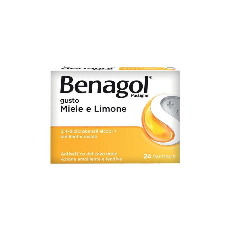 Benagol Pastiglie gusto Ginger e Spezie. Principi attivi: 2,4-diclorobenzil alcool 1,2 mg; amilmetacresolo 0,6 mg. Eccipienti con effetti noti: saccarosio liquido, glucosio liquido (contenente solfiti e amido di frumento), aroma spezie e aroma ginger (contenenti cinnamale, citrale, citronellolo, eugenolo, farnesolo, geraniolo, isoeugenolo e linalolo). Benagol Pastiglie gusto Miele e Limone. Principi attivi: 2,4-diclorobenzil alcool 1,2 mg; amilmetacresolo 0,6 mg. Eccipienti con effettinoti: glucosio liquido (contenente solfiti e amido di frumento), saccarosio liquido, menta essenza e limone essenza (contenenti citrale, d-limonene, geraniolo e linalolo), miele (zucchero invertito). Benagol Pastiglie gusto Limone Senza Zucchero. Principi attivi: 2,4-diclorobenzil alcool 1,2 mg; amilmetacresolo 0,6 mg. Eccipienti con effetti noti:maltitolo liquido, isomalto, aroma di limone (contenente alcol benzilico, citrale, citronellolo, d-limonene, geraniolo e linalolo). BenagolPastiglie gusto Fragola Senza Zucchero. Principi attivi: 2,4-diclorobenzil alcool 1,2 mg; amilmetacresolo 0,6 mg. Eccipienti con effetti noti: maltitolo liquido, isomalto, aroma di fragola (contenente propilene glicole e alcol benzilico). Benagol Pastiglie gusto Menta Fredda. Principi attivi: 2,4-diclorobenzil alcool 1,2 mg; amilmetacresolo 0,6 mg. Eccipienti con effetti noti: saccarosio liquido, glucosio liquido (contenente solfiti e amido di frumento), aroma menta e eucalipto essenza (contenenti glicole propilenico, alcol benzilico, alcol cinnamilico,citrale, citronellolo, d-limonene, eugenolo e linalolo). Benagol Pastiglie gusto Mentolo-Eucaliptolo. Principi attivi: 2,4-diclorobenzil alcool 1,2 mg; amilmetacresolo 0,6 mg; mentolo 8,0 mg. Eccipienti con effetti noti: saccarosio liquido, glucosio liquido (contenente solfiti eamido di frumento) e eucalipto essenza (contenente d-limonene). Benagol Pastiglie con Vitamina C gusto Arancia. Principi attivi: 2,4-diclorobenzil alcool 1,2 mg; amilmetacresolo 0,6 mg; sodio ascorbato 74,9 mg; acido ascorbico 33,5 mg. Eccipienti con effetti noti: saccarosio liquido, glucosio liquido (contenente solfiti e amido di frumento), aromadi arancia (contenente citrale, citronellolo, d-limonene, geraniolo,linalolo), glicole propilenico. Per l'elenco completo degli eccipienti, vedere paragrafo 6.1.