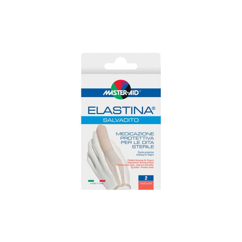 MASTER•AID Elastina SALVADITO Dispositivo medico CE. Medicazione imbottita, sterile, pronta per l'uso. Elevata protezione ed igiene della ferita. Elevato assorbimento dei liquidi, libertà di movimento. Si adatta ad ogni grandezza delle dita e può essere applicata direttamente sulla ferita.