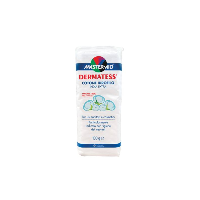 MASTER•AID DERMATESS Dispositivo medico CE, classe I, non sterile. Cotone idrofilo per usi sanitari e cosmetici, indicato per l'igiene dei neonati, l'igiene intima e per l'assorbimento degli essudati. Per la disinfezione della cute non lesa. Ovatta di cotone idrofilo per uso sanitario e dermatologico costituita da fibre di cotone accuratamente pulite e cardate.