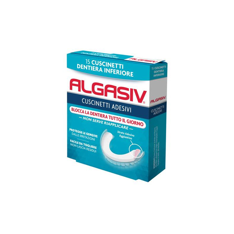 Cuscinetto morbido con due potenti adesivi naturali che blocca la dentiera tutto il giorno, protegge le gengive da fastidiose irritazioni e combatte i cattivi odori della bocca. Algasiv per dentiera inferiore è un morbido cuscinetto, con due potenti adesivi naturali, che blocca la dentiera tutto il giorno, protegge le gengive da fastidiose irritazioni e combatte i cattivi odori della bocca.