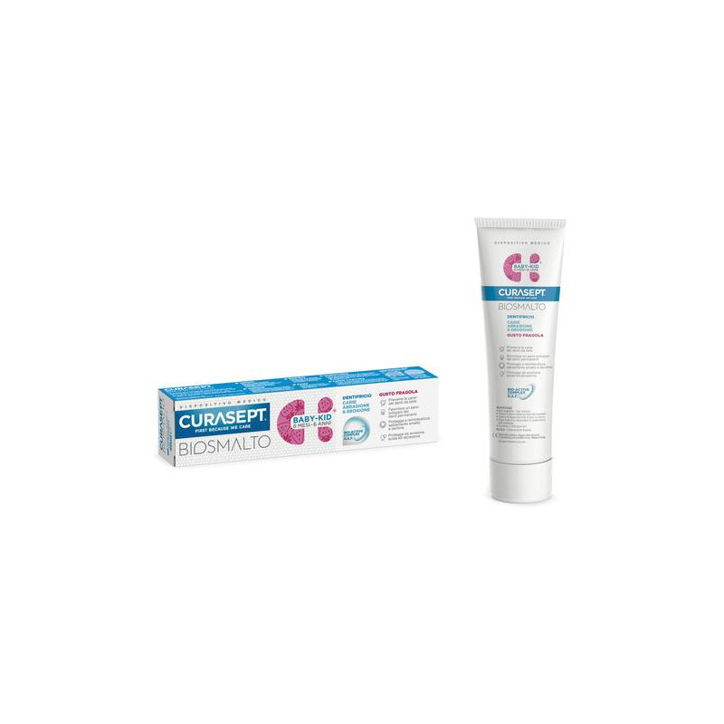 Dentifricio gusto fragola che previene la carie dei denti da latte, in abbinamento a manovre di igiene orale meccanica e a una dieta povera di carboidrati, favorisce un sano sviluppo dei denti permanenti, protegge e remineralizza saldamente smalto e dentina e protegge da erosione acida e abrasione.